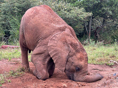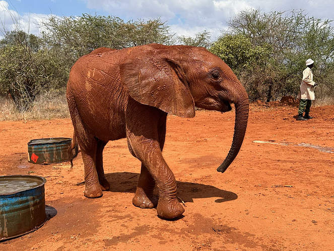 Toto is enjoying his broadened horizons enormously, but there was a bit of a transition period. At midday, when the orphans gather for their milk feed and mud bath, Toto used to pull a hilarious disappearing act: After having his bottle, he would surreptitiously tiptoe over to the path that leads back to the compound. Then, in a swirl of dust, he would disappear around the bend and run at breakneck speed back to his stable, where he knew Joseph was on milk mixing duty. He clearly wanted a quiet hour with his original Keeper while the other orphans mud bathed! We allowed this little break from procedure for as long as Toto needed it — and now, he is one of the most enthusiastic wallowers at the group mud bath.