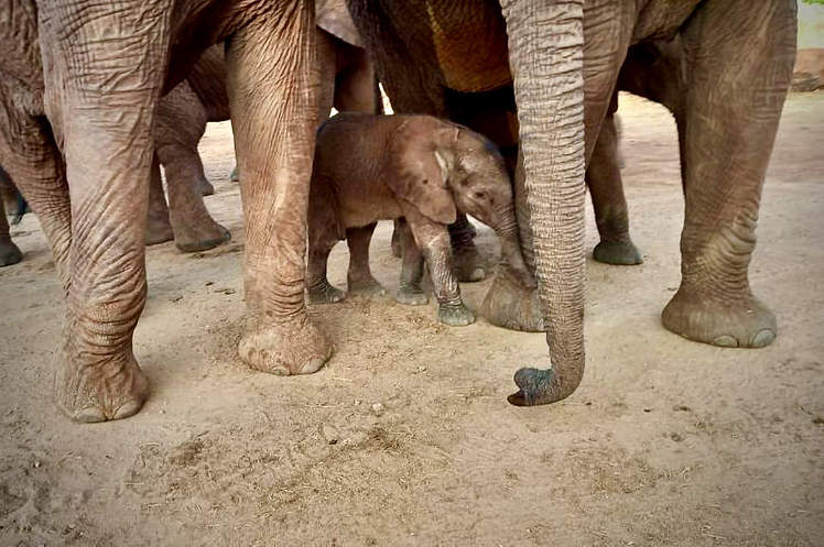 On the afternoon of 1st April 2022, ex-orphans Loijuk; and her baby, Lili; Naisula; Kitirua; and Olare arrived at the Ithumba stockades. Much to the Keepers’ astonishment, they also had a tiny baby in tow. The calf was a few days old at most. He had clearly been without milk, given his weakened body condition and how he tried desperately to nurse from all the females present, but to no avail. Aside from Loijuk, who had baby Lili by her side, none of the females were old enough to be pregnant nor lactating, and certainly none of them were the baby’s mother.